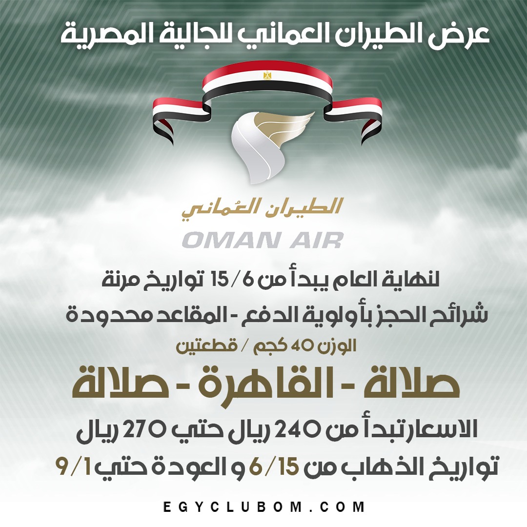 آخر ماتوصل إليه مجلس إدارة النادي الاجتماعي للجالية المصرية بسلطنة عمان مع شركة الطيران العماني وشركة مصر للطيران بخصوص العروض المخفضة المقدمة لأبناء الجالية المصرية المقيمة على أرض سلطنة عمان وذلك لتذاكر سفر قضاء إجازة نهاية العام الدراسي وتبدأ العروض من 15 / 6 / 2023 ذهاب والعودة حتى تاريخ 1 / 9 / 2023م