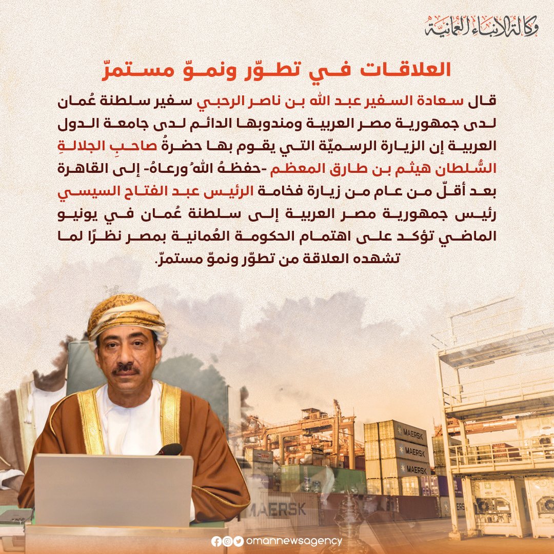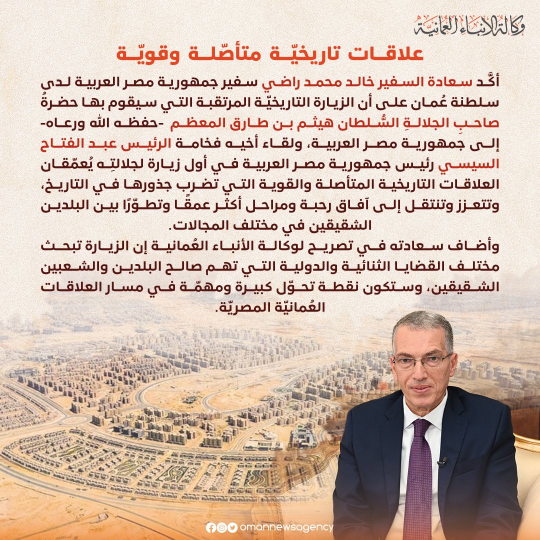بمشيئةِ اللهِ تعالى وتوفيقِه سيقوم حضرةُ صاحبِ الجلالةِ السُّلطان هيثم بن طارق المعظم /حفظهُ اللهُ ورعاهُ/ بزيارة رسميّة إلى جمهورية مصر العربيّة الشقيقة يوم الأحد القادم.